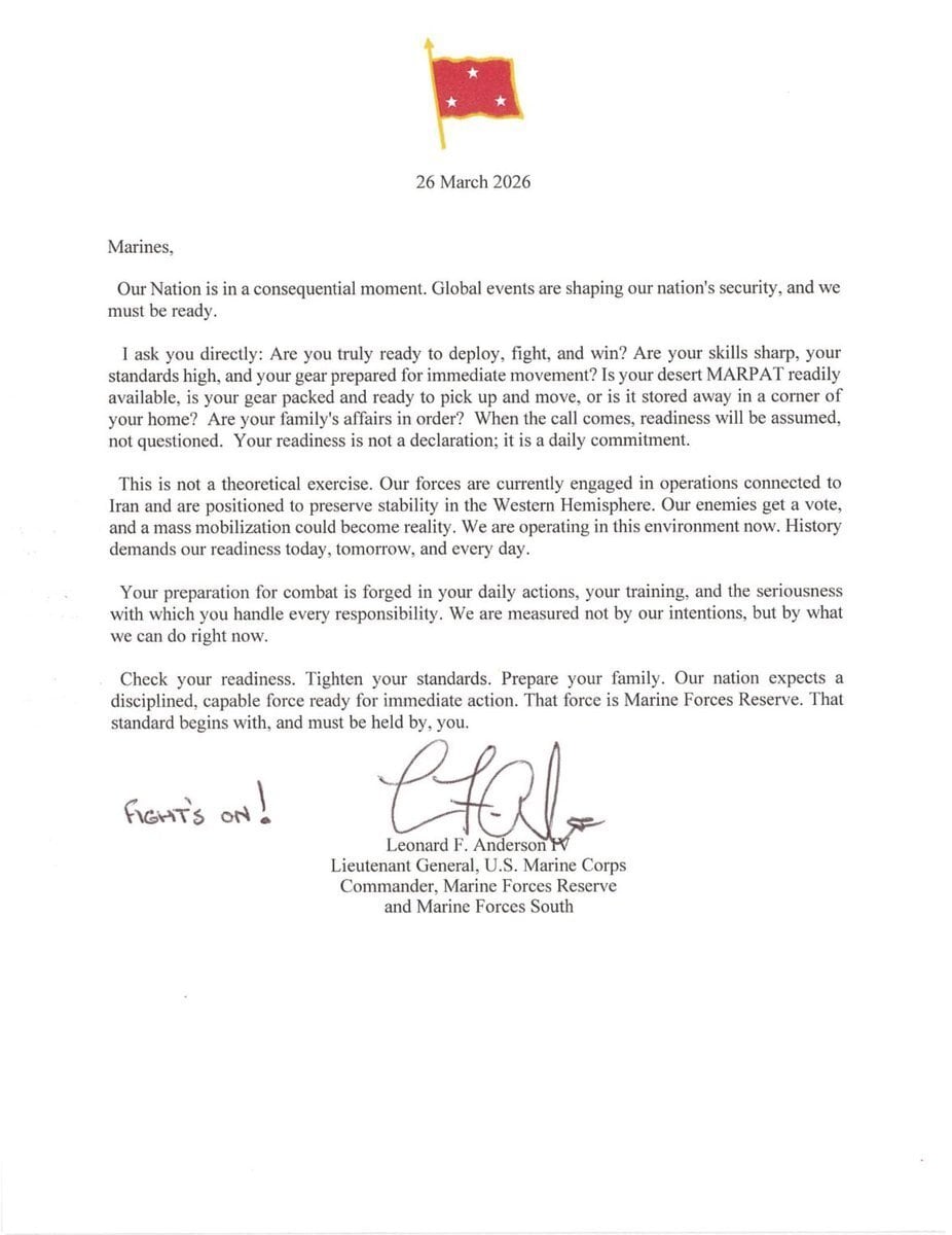 In a March 26 message on his official letterhead, Lt. Gen. Leonard F. Anderson IV asked his troops to consider whether they were ready for the possibility of being called up in the Iran war.